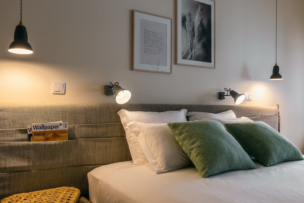 The 55m², our One-bedroom apartments offer comfort distributed between an open kitchen that extends into the living room and a separate bedroom. Bright and decorated with neutral tones and designer pieces, they exude a contemporary island vibe. Designed to feel like home, not just a hotel. Enjoy conversations at the kitchen island with a glass of wine in hand, and prepare meals with our full range of Smeg appliances.
